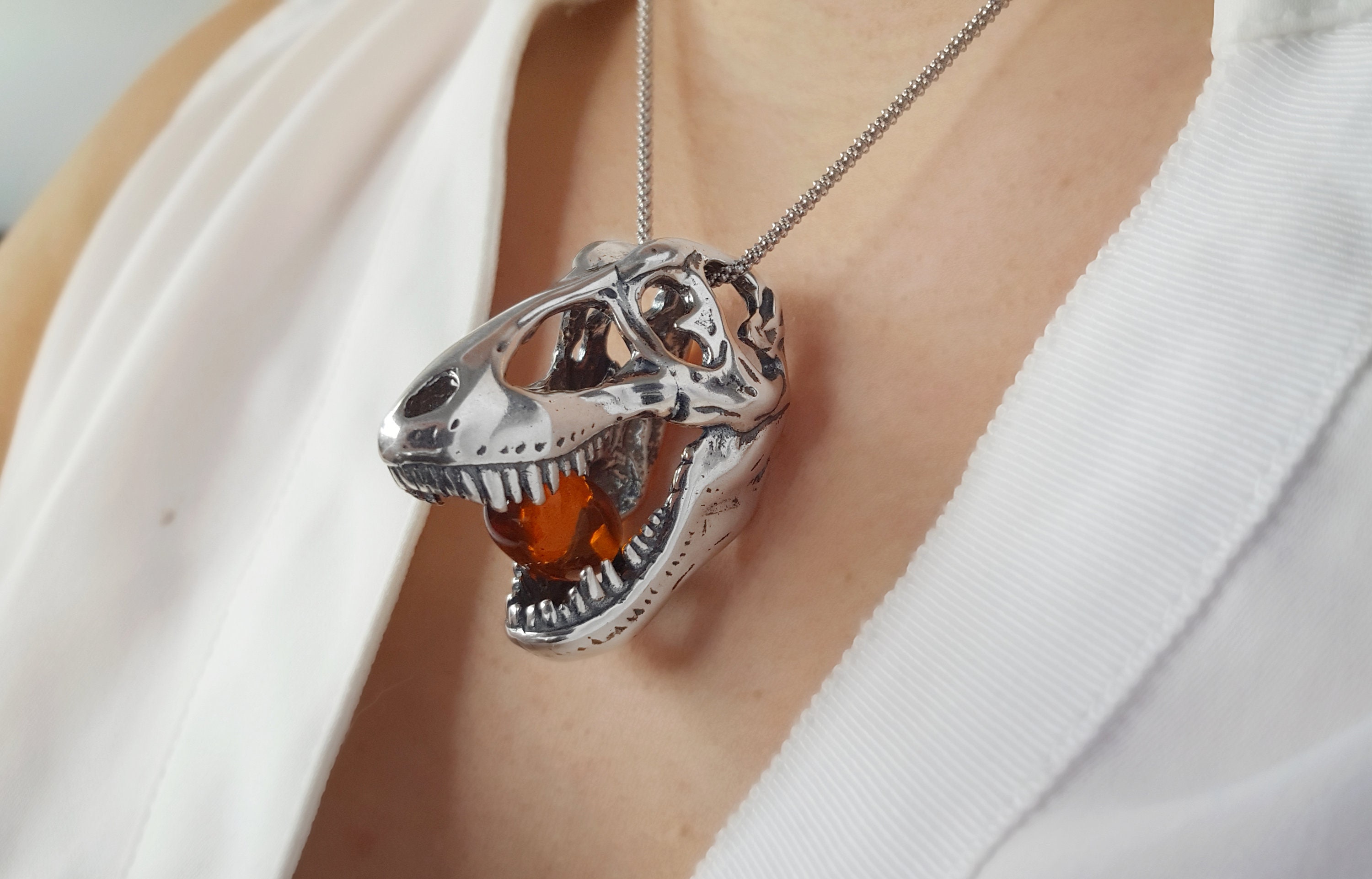 T Rex Dinosaur Skull Sterling Silver Necklace With Amber Jewelry By Glassando